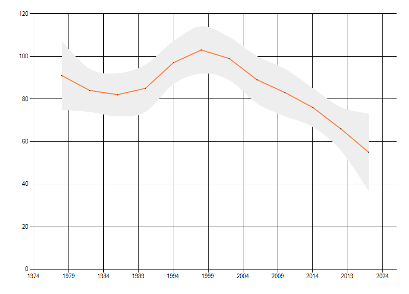 Gemiddelde trend van het aantal kilometerhokken waarin de soort voorkomt, weergegeven als indexcijfer (1975-1978 = 100).