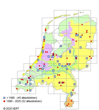 Het aantal atlasblokken (5x5 km) waarin de soort is gemeld binnen een periode van vijf jaar (vanaf 1980) of twintig jaar. Niet gecorrigeerd voor waarnemersinspanning en het aantal doorgegeven waarnemingen kan sterk variëren per periode, dus een trend in verspreiding kan hier niet direct uit worden afgelezen. Het opgegeven jaartal is het eerste jaar van de periode. Bron: gevalideerde waarnemingen uit de NDFF.