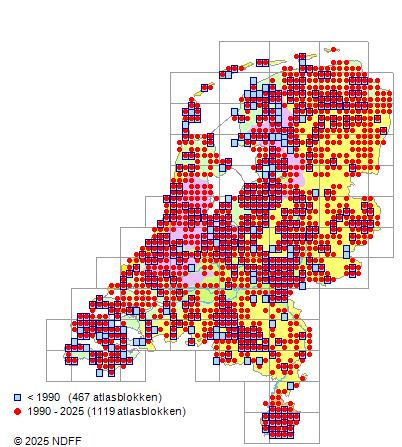 Het aantal atlasblokken (5x5 km) waarin de soort is gemeld binnen een periode van vijf jaar (vanaf 1980) of twintig jaar. Niet gecorrigeerd voor waarnemersinspanning en het aantal doorgegeven waarnemingen kan sterk variëren per periode, dus een trend in verspreiding kan hier niet direct uit worden afgelezen. Het opgegeven jaartal is het eerste jaar van de periode. Bron: gevalideerde waarnemingen uit de NDFF.