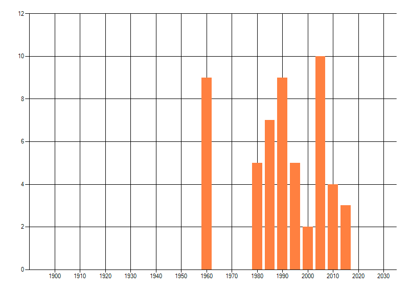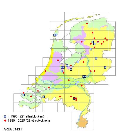 Het aantal atlasblokken (5x5 km) waarin de soort is gemeld binnen een periode van vijf jaar (vanaf 1980) of twintig jaar. Niet gecorrigeerd voor waarnemersinspanning en het aantal doorgegeven waarnemingen kan sterk variëren per periode, dus een trend in verspreiding kan hier niet direct uit worden afgelezen. Het opgegeven jaartal is het eerste jaar van de periode. Bron: gevalideerde waarnemingen uit de NDFF.