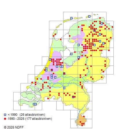 Het aantal atlasblokken (5x5 km) waarin de soort is gemeld binnen een periode van vijf jaar (vanaf 1980) of twintig jaar. Niet gecorrigeerd voor waarnemersinspanning en het aantal doorgegeven waarnemingen kan sterk variëren per periode, dus een trend in verspreiding kan hier niet direct uit worden afgelezen. Het opgegeven jaartal is het eerste jaar van de periode. Bron: gevalideerde waarnemingen uit de NDFF.