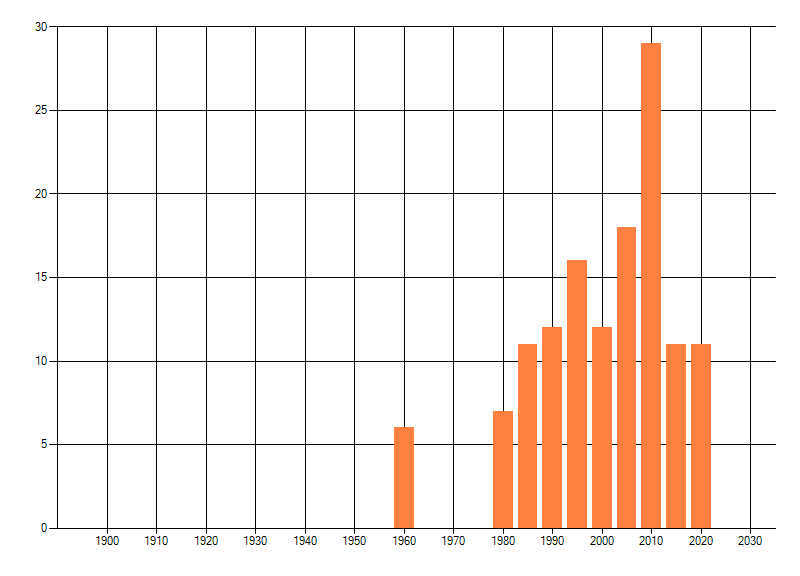 Het aantal atlasblokken (5x5 km) waarin de soort is gemeld binnen een periode van vijf jaar (vanaf 1980) of twintig jaar. Niet gecorrigeerd voor waarnemersinspanning en het aantal doorgegeven waarnemingen kan sterk variëren per periode, dus een trend in verspreiding kan hier niet direct uit worden afgelezen. Het opgegeven jaartal is het eerste jaar van de periode. Bron: gevalideerde waarnemingen uit de NDFF.