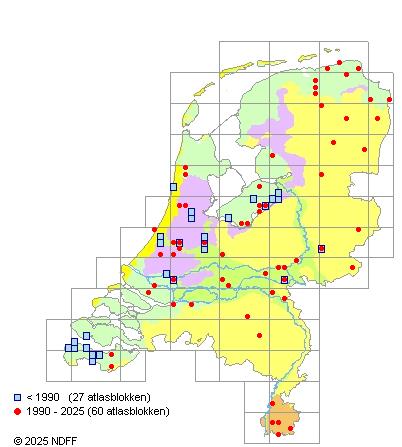 Het aantal atlasblokken (5x5 km) waarin de soort is gemeld binnen een periode van vijf jaar (vanaf 1980) of twintig jaar. Niet gecorrigeerd voor waarnemersinspanning en het aantal doorgegeven waarnemingen kan sterk variëren per periode, dus een trend in verspreiding kan hier niet direct uit worden afgelezen. Het opgegeven jaartal is het eerste jaar van de periode. Bron: gevalideerde waarnemingen uit de NDFF.