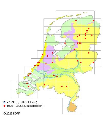 Het aantal atlasblokken (5x5 km) waarin de soort is gemeld binnen een periode van vijf jaar (vanaf 1980) of twintig jaar. Niet gecorrigeerd voor waarnemersinspanning en het aantal doorgegeven waarnemingen kan sterk variëren per periode, dus een trend in verspreiding kan hier niet direct uit worden afgelezen. Het opgegeven jaartal is het eerste jaar van de periode. Bron: gevalideerde waarnemingen uit de NDFF.