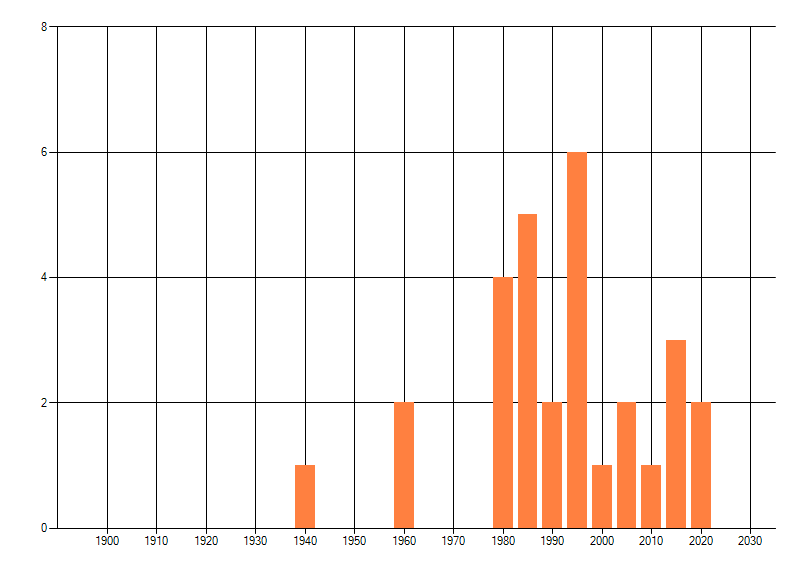 Het aantal atlasblokken (5x5 km) waarin de soort is gemeld binnen een periode van vijf jaar (vanaf 1980) of twintig jaar. Niet gecorrigeerd voor waarnemersinspanning en het aantal doorgegeven waarnemingen kan sterk variëren per periode, dus een trend in verspreiding kan hier niet direct uit worden afgelezen. Het opgegeven jaartal is het eerste jaar van de periode. Bron: gevalideerde waarnemingen uit de NDFF.