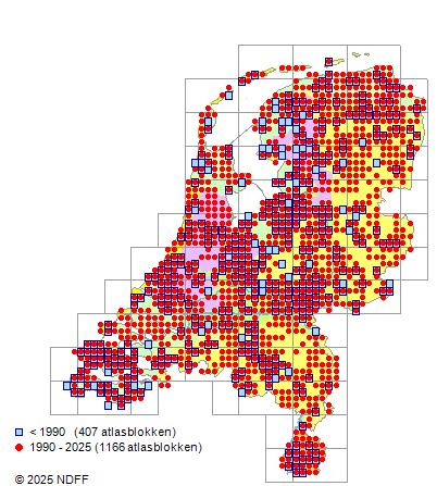 Het aantal atlasblokken (5x5 km) waarin de soort is gemeld binnen een periode van vijf jaar (vanaf 1980) of twintig jaar. Niet gecorrigeerd voor waarnemersinspanning en het aantal doorgegeven waarnemingen kan sterk variëren per periode, dus een trend in verspreiding kan hier niet direct uit worden afgelezen. Het opgegeven jaartal is het eerste jaar van de periode. Bron: gevalideerde waarnemingen uit de NDFF.