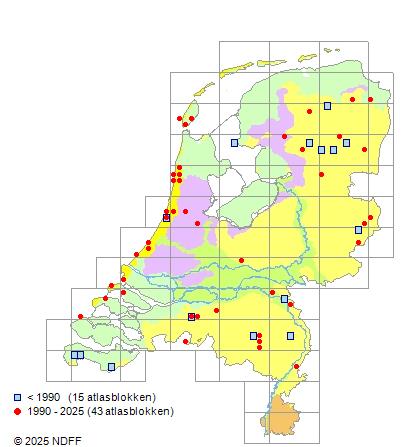 Het aantal atlasblokken (5x5 km) waarin de soort is gemeld binnen een periode van vijf jaar (vanaf 1980) of twintig jaar. Niet gecorrigeerd voor waarnemersinspanning en het aantal doorgegeven waarnemingen kan sterk variëren per periode, dus een trend in verspreiding kan hier niet direct uit worden afgelezen. Het opgegeven jaartal is het eerste jaar van de periode. Bron: gevalideerde waarnemingen uit de NDFF.
