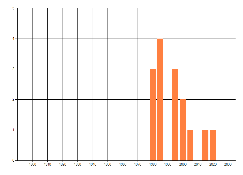 Het aantal atlasblokken (5x5 km) waarin de soort is gemeld binnen een periode van vijf jaar (vanaf 1980) of twintig jaar. Niet gecorrigeerd voor waarnemersinspanning en het aantal doorgegeven waarnemingen kan sterk variëren per periode, dus een trend in verspreiding kan hier niet direct uit worden afgelezen. Het opgegeven jaartal is het eerste jaar van de periode. Bron: gevalideerde waarnemingen uit de NDFF.