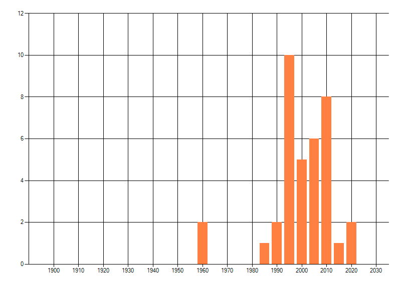 Het aantal atlasblokken (5x5 km) waarin de soort is gemeld binnen een periode van vijf jaar (vanaf 1980) of twintig jaar. Niet gecorrigeerd voor waarnemersinspanning en het aantal doorgegeven waarnemingen kan sterk variëren per periode, dus een trend in verspreiding kan hier niet direct uit worden afgelezen. Het opgegeven jaartal is het eerste jaar van de periode. Bron: gevalideerde waarnemingen uit de NDFF.