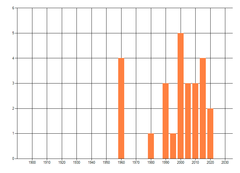 Het aantal atlasblokken (5x5 km) waarin de soort is gemeld binnen een periode van vijf jaar (vanaf 1980) of twintig jaar. Niet gecorrigeerd voor waarnemersinspanning en het aantal doorgegeven waarnemingen kan sterk variëren per periode, dus een trend in verspreiding kan hier niet direct uit worden afgelezen. Het opgegeven jaartal is het eerste jaar van de periode. Bron: gevalideerde waarnemingen uit de NDFF.