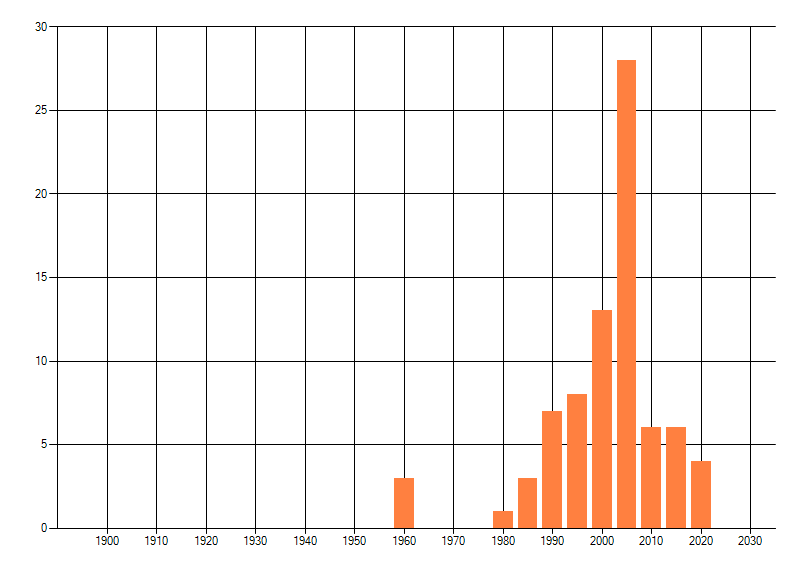 Het aantal atlasblokken (5x5 km) waarin de soort is gemeld binnen een periode van vijf jaar (vanaf 1980) of twintig jaar. Niet gecorrigeerd voor waarnemersinspanning en het aantal doorgegeven waarnemingen kan sterk variëren per periode, dus een trend in verspreiding kan hier niet direct uit worden afgelezen. Het opgegeven jaartal is het eerste jaar van de periode. Bron: gevalideerde waarnemingen uit de NDFF.