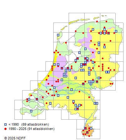 Het aantal atlasblokken (5x5 km) waarin de soort is gemeld binnen een periode van vijf jaar (vanaf 1980) of twintig jaar. Niet gecorrigeerd voor waarnemersinspanning en het aantal doorgegeven waarnemingen kan sterk variëren per periode, dus een trend in verspreiding kan hier niet direct uit worden afgelezen. Het opgegeven jaartal is het eerste jaar van de periode. Bron: gevalideerde waarnemingen uit de NDFF.