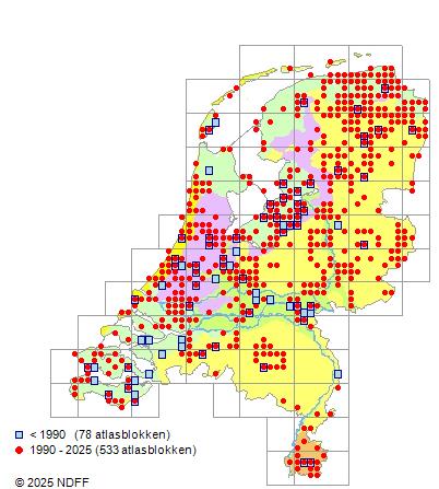 Het aantal atlasblokken (5x5 km) waarin de soort is gemeld binnen een periode van vijf jaar (vanaf 1980) of twintig jaar. Niet gecorrigeerd voor waarnemersinspanning en het aantal doorgegeven waarnemingen kan sterk variëren per periode, dus een trend in verspreiding kan hier niet direct uit worden afgelezen. Het opgegeven jaartal is het eerste jaar van de periode. Bron: gevalideerde waarnemingen uit de NDFF.