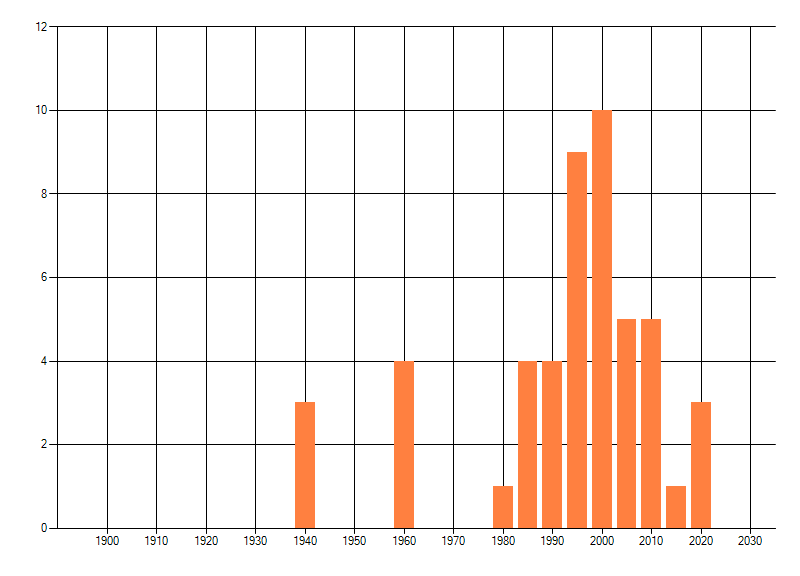 Het aantal atlasblokken (5x5 km) waarin de soort is gemeld binnen een periode van vijf jaar (vanaf 1980) of twintig jaar. Niet gecorrigeerd voor waarnemersinspanning en het aantal doorgegeven waarnemingen kan sterk variëren per periode, dus een trend in verspreiding kan hier niet direct uit worden afgelezen. Het opgegeven jaartal is het eerste jaar van de periode. Bron: gevalideerde waarnemingen uit de NDFF.
