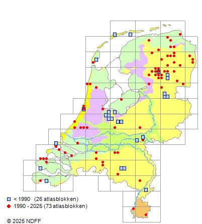Het aantal atlasblokken (5x5 km) waarin de soort is gemeld binnen een periode van vijf jaar (vanaf 1980) of twintig jaar. Niet gecorrigeerd voor waarnemersinspanning en het aantal doorgegeven waarnemingen kan sterk variëren per periode, dus een trend in verspreiding kan hier niet direct uit worden afgelezen. Het opgegeven jaartal is het eerste jaar van de periode. Bron: gevalideerde waarnemingen uit de NDFF.