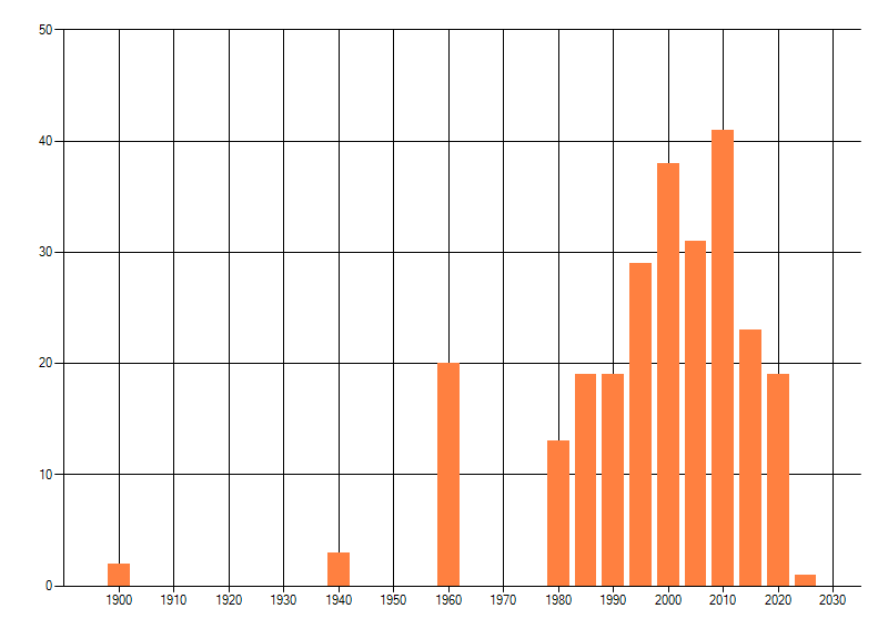 Het aantal atlasblokken (5x5 km) waarin de soort is gemeld binnen een periode van vijf jaar (vanaf 1980) of twintig jaar. Niet gecorrigeerd voor waarnemersinspanning en het aantal doorgegeven waarnemingen kan sterk variëren per periode, dus een trend in verspreiding kan hier niet direct uit worden afgelezen. Het opgegeven jaartal is het eerste jaar van de periode. Bron: gevalideerde waarnemingen uit de NDFF.