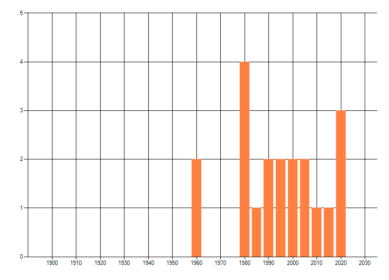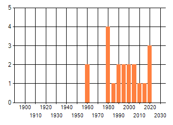 Het aantal atlasblokken (5x5 km) waarin de soort is gemeld binnen een periode van vijf jaar (vanaf 1980) of twintig jaar. Niet gecorrigeerd voor waarnemersinspanning en het aantal doorgegeven waarnemingen kan sterk variëren per periode, dus een trend in verspreiding kan hier niet direct uit worden afgelezen. Het opgegeven jaartal is het eerste jaar van de periode. Bron: gevalideerde waarnemingen uit de NDFF.