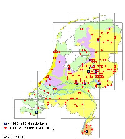 Het aantal atlasblokken (5x5 km) waarin de soort is gemeld binnen een periode van vijf jaar (vanaf 1980) of twintig jaar. Niet gecorrigeerd voor waarnemersinspanning en het aantal doorgegeven waarnemingen kan sterk variëren per periode, dus een trend in verspreiding kan hier niet direct uit worden afgelezen. Het opgegeven jaartal is het eerste jaar van de periode. Bron: gevalideerde waarnemingen uit de NDFF.