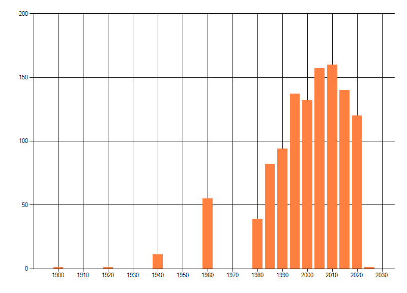 Het aantal atlasblokken (5x5 km) waarin de soort is gemeld binnen een periode van vijf jaar (vanaf 1980) of twintig jaar. Niet gecorrigeerd voor waarnemersinspanning en het aantal doorgegeven waarnemingen kan sterk variëren per periode, dus een trend in verspreiding kan hier niet direct uit worden afgelezen. Het opgegeven jaartal is het eerste jaar van de periode. Bron: gevalideerde waarnemingen uit de NDFF.