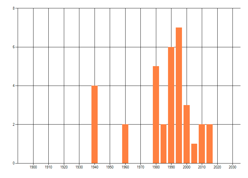 Het aantal atlasblokken (5x5 km) waarin de soort is gemeld binnen een periode van vijf jaar (vanaf 1980) of twintig jaar. Niet gecorrigeerd voor waarnemersinspanning en het aantal doorgegeven waarnemingen kan sterk variëren per periode, dus een trend in verspreiding kan hier niet direct uit worden afgelezen. Het opgegeven jaartal is het eerste jaar van de periode. Bron: gevalideerde waarnemingen uit de NDFF.
