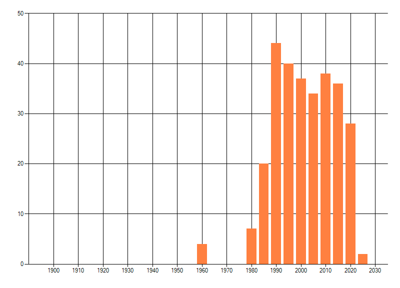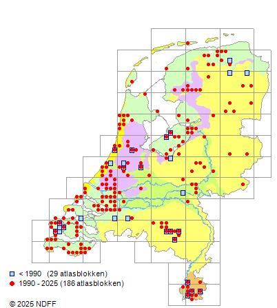 Het aantal atlasblokken (5x5 km) waarin de soort is gemeld binnen een periode van vijf jaar (vanaf 1980) of twintig jaar. Niet gecorrigeerd voor waarnemersinspanning en het aantal doorgegeven waarnemingen kan sterk variëren per periode, dus een trend in verspreiding kan hier niet direct uit worden afgelezen. Het opgegeven jaartal is het eerste jaar van de periode. Bron: gevalideerde waarnemingen uit de NDFF.