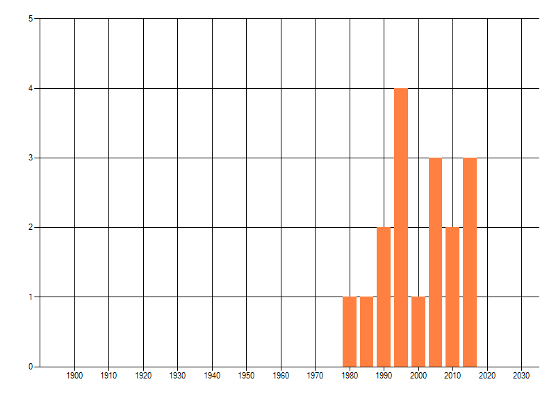 Het aantal atlasblokken (5x5 km) waarin de soort is gemeld binnen een periode van vijf jaar (vanaf 1980) of twintig jaar. Niet gecorrigeerd voor waarnemersinspanning en het aantal doorgegeven waarnemingen kan sterk variëren per periode, dus een trend in verspreiding kan hier niet direct uit worden afgelezen. Het opgegeven jaartal is het eerste jaar van de periode. Bron: gevalideerde waarnemingen uit de NDFF.