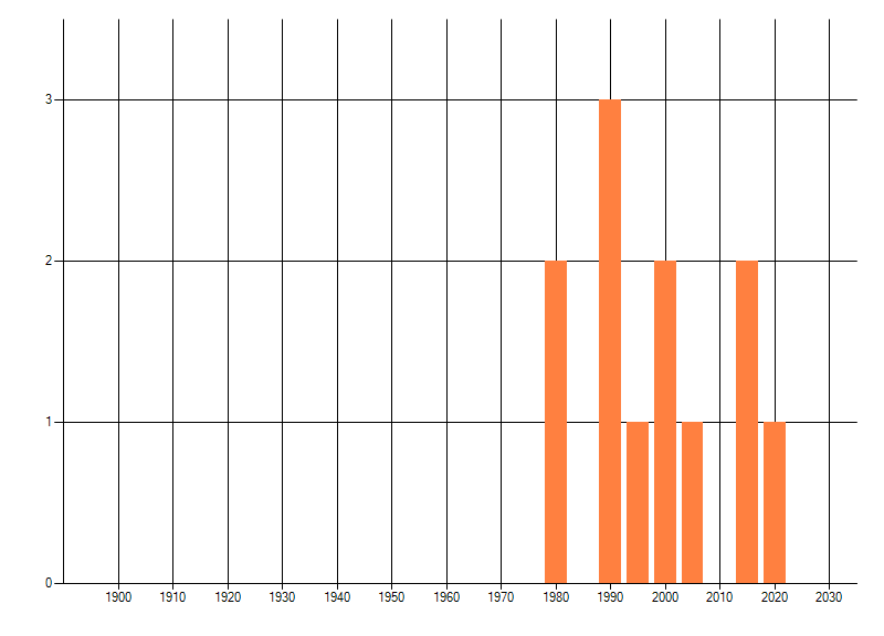 Het aantal atlasblokken (5x5 km) waarin de soort is gemeld binnen een periode van vijf jaar (vanaf 1980) of twintig jaar. Niet gecorrigeerd voor waarnemersinspanning en het aantal doorgegeven waarnemingen kan sterk variëren per periode, dus een trend in verspreiding kan hier niet direct uit worden afgelezen. Het opgegeven jaartal is het eerste jaar van de periode. Bron: gevalideerde waarnemingen uit de NDFF.