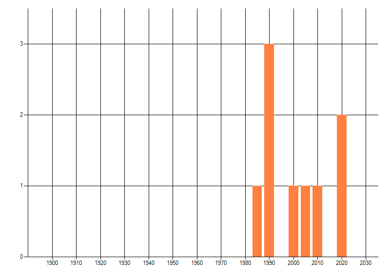 Het aantal atlasblokken (5x5 km) waarin de soort is gemeld binnen een periode van vijf jaar (vanaf 1980) of twintig jaar. Niet gecorrigeerd voor waarnemersinspanning en het aantal doorgegeven waarnemingen kan sterk variëren per periode, dus een trend in verspreiding kan hier niet direct uit worden afgelezen. Het opgegeven jaartal is het eerste jaar van de periode. Bron: gevalideerde waarnemingen uit de NDFF.