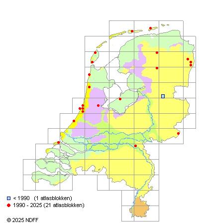 Het aantal atlasblokken (5x5 km) waarin de soort is gemeld binnen een periode van vijf jaar (vanaf 1980) of twintig jaar. Niet gecorrigeerd voor waarnemersinspanning en het aantal doorgegeven waarnemingen kan sterk variëren per periode, dus een trend in verspreiding kan hier niet direct uit worden afgelezen. Het opgegeven jaartal is het eerste jaar van de periode. Bron: gevalideerde waarnemingen uit de NDFF.