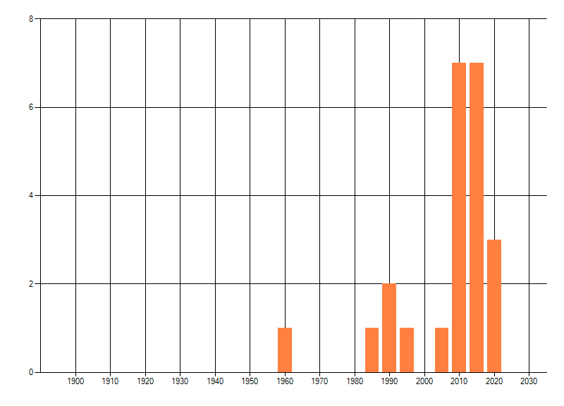 Het aantal atlasblokken (5x5 km) waarin de soort is gemeld binnen een periode van vijf jaar (vanaf 1980) of twintig jaar. Niet gecorrigeerd voor waarnemersinspanning en het aantal doorgegeven waarnemingen kan sterk variëren per periode, dus een trend in verspreiding kan hier niet direct uit worden afgelezen. Het opgegeven jaartal is het eerste jaar van de periode. Bron: gevalideerde waarnemingen uit de NDFF.