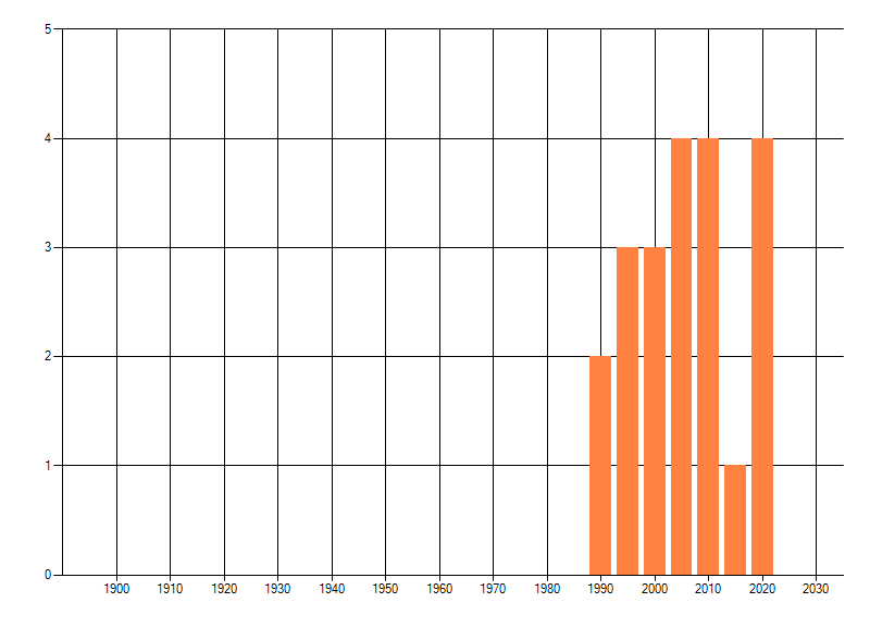Het aantal atlasblokken (5x5 km) waarin de soort is gemeld binnen een periode van vijf jaar (vanaf 1980) of twintig jaar. Niet gecorrigeerd voor waarnemersinspanning en het aantal doorgegeven waarnemingen kan sterk variëren per periode, dus een trend in verspreiding kan hier niet direct uit worden afgelezen. Het opgegeven jaartal is het eerste jaar van de periode. Bron: gevalideerde waarnemingen uit de NDFF.