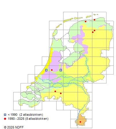 Het aantal atlasblokken (5x5 km) waarin de soort is gemeld binnen een periode van vijf jaar (vanaf 1980) of twintig jaar. Niet gecorrigeerd voor waarnemersinspanning en het aantal doorgegeven waarnemingen kan sterk variëren per periode, dus een trend in verspreiding kan hier niet direct uit worden afgelezen. Het opgegeven jaartal is het eerste jaar van de periode. Bron: gevalideerde waarnemingen uit de NDFF.
