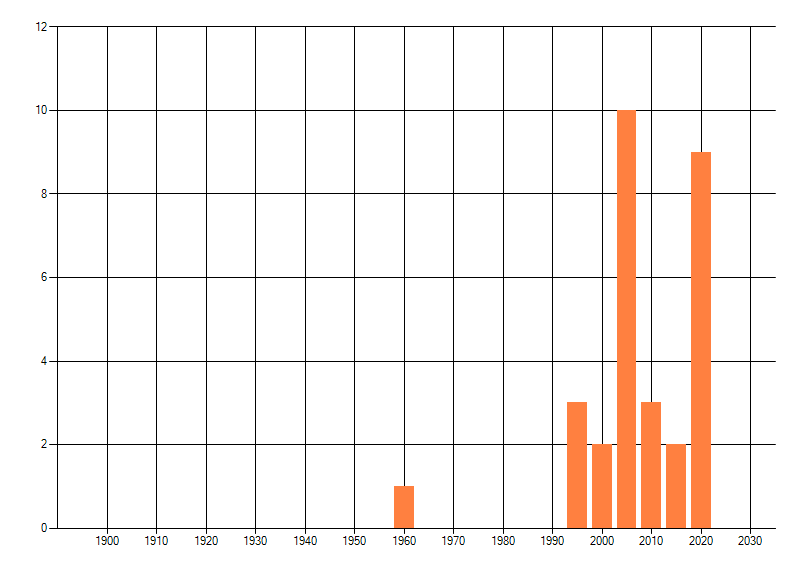Het aantal atlasblokken (5x5 km) waarin de soort is gemeld binnen een periode van vijf jaar (vanaf 1980) of twintig jaar. Niet gecorrigeerd voor waarnemersinspanning en het aantal doorgegeven waarnemingen kan sterk variëren per periode, dus een trend in verspreiding kan hier niet direct uit worden afgelezen. Het opgegeven jaartal is het eerste jaar van de periode. Bron: gevalideerde waarnemingen uit de NDFF.