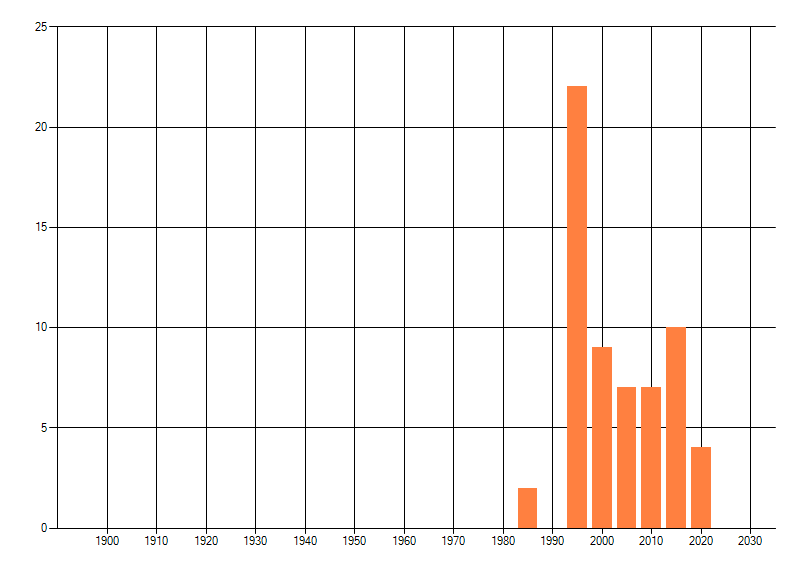 Het aantal atlasblokken (5x5 km) waarin de soort is gemeld binnen een periode van vijf jaar (vanaf 1980) of twintig jaar. Niet gecorrigeerd voor waarnemersinspanning en het aantal doorgegeven waarnemingen kan sterk variëren per periode, dus een trend in verspreiding kan hier niet direct uit worden afgelezen. Het opgegeven jaartal is het eerste jaar van de periode. Bron: gevalideerde waarnemingen uit de NDFF.