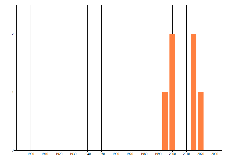 Het aantal atlasblokken (5x5 km) waarin de soort is gemeld binnen een periode van vijf jaar (vanaf 1980) of twintig jaar. Niet gecorrigeerd voor waarnemersinspanning en het aantal doorgegeven waarnemingen kan sterk variëren per periode, dus een trend in verspreiding kan hier niet direct uit worden afgelezen. Het opgegeven jaartal is het eerste jaar van de periode. Bron: gevalideerde waarnemingen uit de NDFF.