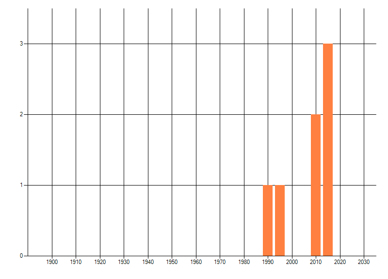Het aantal atlasblokken (5x5 km) waarin de soort is gemeld binnen een periode van vijf jaar (vanaf 1980) of twintig jaar. Niet gecorrigeerd voor waarnemersinspanning en het aantal doorgegeven waarnemingen kan sterk variëren per periode, dus een trend in verspreiding kan hier niet direct uit worden afgelezen. Het opgegeven jaartal is het eerste jaar van de periode. Bron: gevalideerde waarnemingen uit de NDFF.