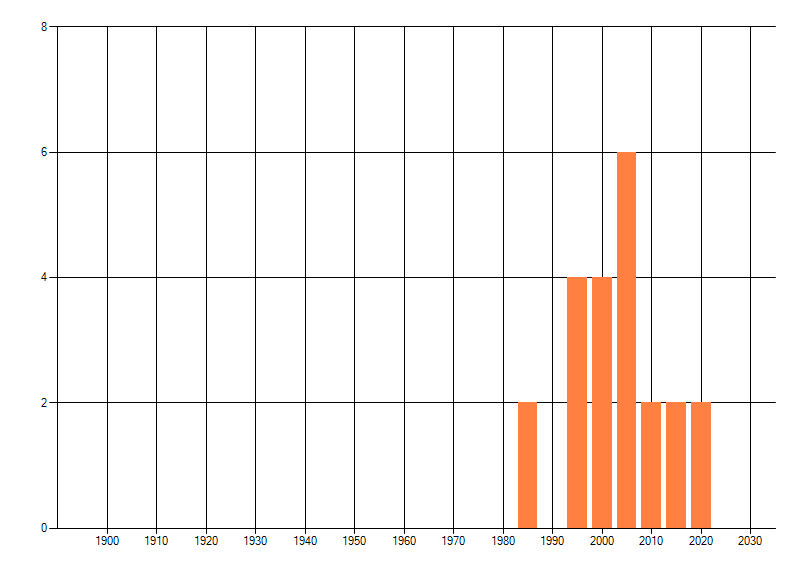 Het aantal atlasblokken (5x5 km) waarin de soort is gemeld binnen een periode van vijf jaar (vanaf 1980) of twintig jaar. Niet gecorrigeerd voor waarnemersinspanning en het aantal doorgegeven waarnemingen kan sterk variëren per periode, dus een trend in verspreiding kan hier niet direct uit worden afgelezen. Het opgegeven jaartal is het eerste jaar van de periode. Bron: gevalideerde waarnemingen uit de NDFF.