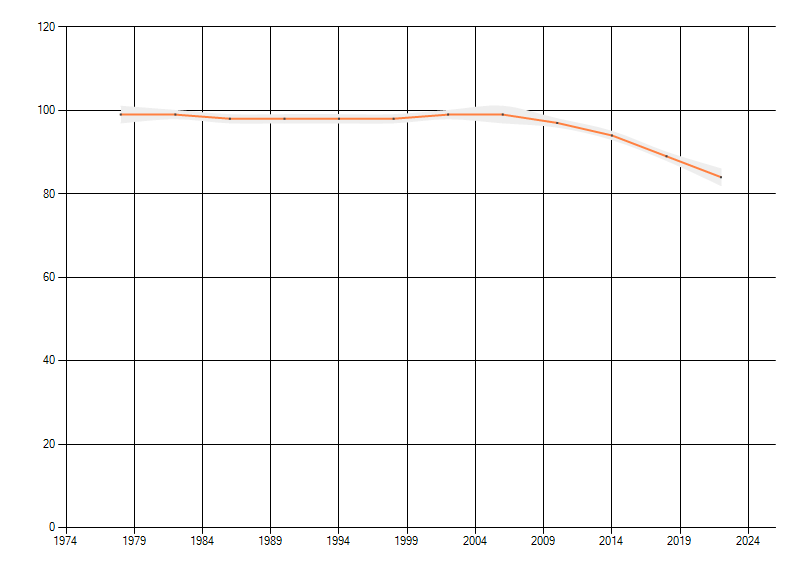 Gemiddelde trend van het aantal kilometerhokken waarin de soort voorkomt, weergegeven als indexcijfer (1975-1978 = 100).