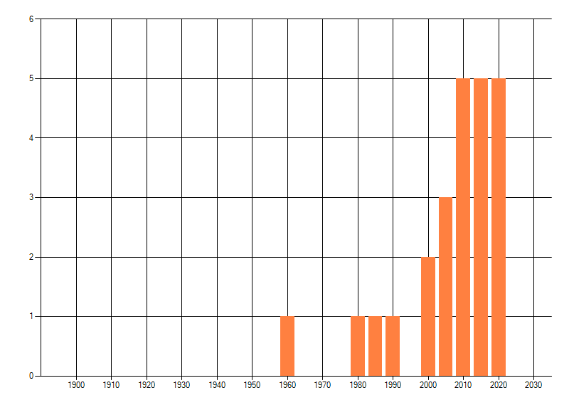 Het aantal atlasblokken (5x5 km) waarin de soort is gemeld binnen een periode van vijf jaar (vanaf 1980) of twintig jaar. Niet gecorrigeerd voor waarnemersinspanning en het aantal doorgegeven waarnemingen kan sterk variëren per periode, dus een trend in verspreiding kan hier niet direct uit worden afgelezen. Het opgegeven jaartal is het eerste jaar van de periode. Bron: gevalideerde waarnemingen uit de NDFF.