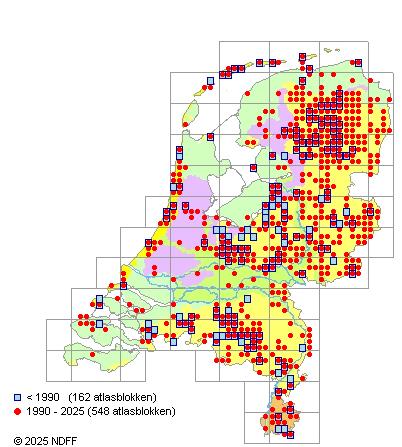 Het aantal atlasblokken (5x5 km) waarin de soort is gemeld binnen een periode van vijf jaar (vanaf 1980) of twintig jaar. Niet gecorrigeerd voor waarnemersinspanning en het aantal doorgegeven waarnemingen kan sterk variëren per periode, dus een trend in verspreiding kan hier niet direct uit worden afgelezen. Het opgegeven jaartal is het eerste jaar van de periode. Bron: gevalideerde waarnemingen uit de NDFF.