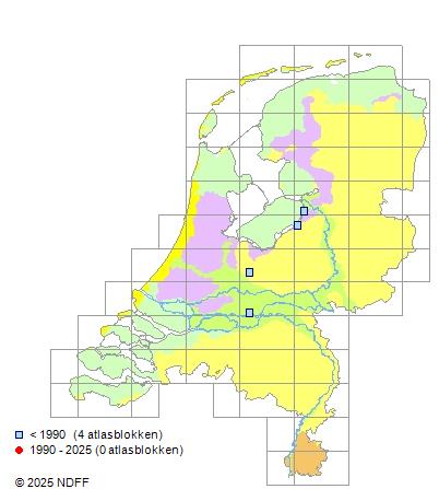 Het aantal atlasblokken (5x5 km) waarin de soort is gemeld binnen een periode van vijf jaar (vanaf 1980) of twintig jaar. Niet gecorrigeerd voor waarnemersinspanning en het aantal doorgegeven waarnemingen kan sterk variëren per periode, dus een trend in verspreiding kan hier niet direct uit worden afgelezen. Het opgegeven jaartal is het eerste jaar van de periode. Bron: gevalideerde waarnemingen uit de NDFF.