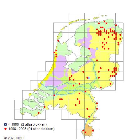Het aantal atlasblokken (5x5 km) waarin de soort is gemeld binnen een periode van vijf jaar (vanaf 1980) of twintig jaar. Niet gecorrigeerd voor waarnemersinspanning en het aantal doorgegeven waarnemingen kan sterk variëren per periode, dus een trend in verspreiding kan hier niet direct uit worden afgelezen. Het opgegeven jaartal is het eerste jaar van de periode. Bron: gevalideerde waarnemingen uit de NDFF.