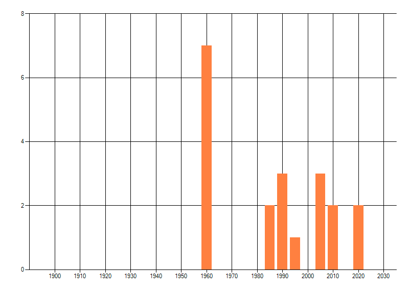 Het aantal atlasblokken (5x5 km) waarin de soort is gemeld binnen een periode van vijf jaar (vanaf 1980) of twintig jaar. Niet gecorrigeerd voor waarnemersinspanning en het aantal doorgegeven waarnemingen kan sterk variëren per periode, dus een trend in verspreiding kan hier niet direct uit worden afgelezen. Het opgegeven jaartal is het eerste jaar van de periode. Bron: gevalideerde waarnemingen uit de NDFF.
