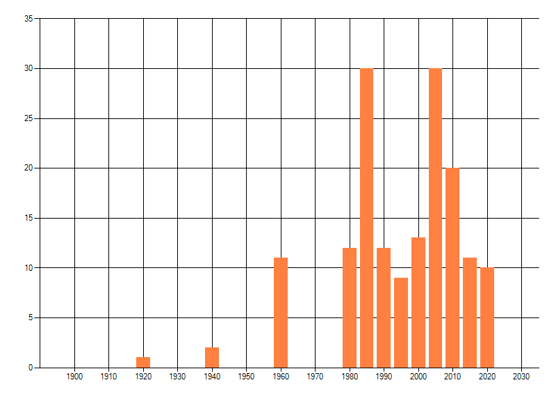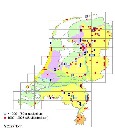 Het aantal atlasblokken (5x5 km) waarin de soort is gemeld binnen een periode van vijf jaar (vanaf 1980) of twintig jaar. Niet gecorrigeerd voor waarnemersinspanning en het aantal doorgegeven waarnemingen kan sterk variëren per periode, dus een trend in verspreiding kan hier niet direct uit worden afgelezen. Het opgegeven jaartal is het eerste jaar van de periode. Bron: gevalideerde waarnemingen uit de NDFF.
