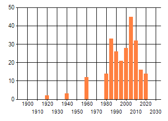 Het aantal atlasblokken (5x5 km) waarin de soort is gemeld binnen een periode van vijf jaar (vanaf 1980) of twintig jaar. Niet gecorrigeerd voor waarnemersinspanning en het aantal doorgegeven waarnemingen kan sterk variëren per periode, dus een trend in verspreiding kan hier niet direct uit worden afgelezen. Het opgegeven jaartal is het eerste jaar van de periode. Bron: gevalideerde waarnemingen uit de NDFF.
