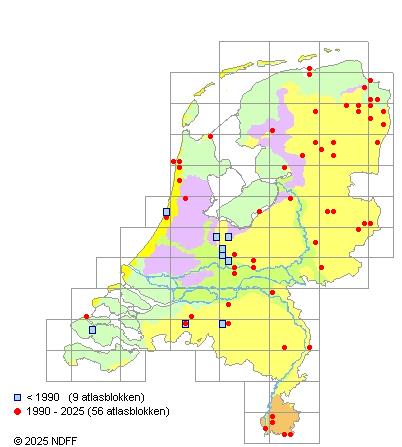 Het aantal atlasblokken (5x5 km) waarin de soort is gemeld binnen een periode van vijf jaar (vanaf 1980) of twintig jaar. Niet gecorrigeerd voor waarnemersinspanning en het aantal doorgegeven waarnemingen kan sterk variëren per periode, dus een trend in verspreiding kan hier niet direct uit worden afgelezen. Het opgegeven jaartal is het eerste jaar van de periode. Bron: gevalideerde waarnemingen uit de NDFF.