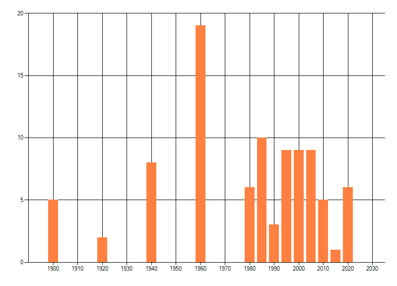 Het aantal atlasblokken (5x5 km) waarin de soort is gemeld binnen een periode van vijf jaar (vanaf 1980) of twintig jaar. Niet gecorrigeerd voor waarnemersinspanning en het aantal doorgegeven waarnemingen kan sterk variëren per periode, dus een trend in verspreiding kan hier niet direct uit worden afgelezen. Het opgegeven jaartal is het eerste jaar van de periode. Bron: gevalideerde waarnemingen uit de NDFF.