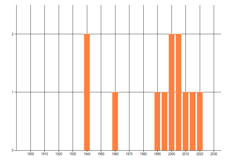 Het aantal atlasblokken (5x5 km) waarin de soort is gemeld binnen een periode van vijf jaar (vanaf 1980) of twintig jaar. Niet gecorrigeerd voor waarnemersinspanning en het aantal doorgegeven waarnemingen kan sterk variëren per periode, dus een trend in verspreiding kan hier niet direct uit worden afgelezen. Het opgegeven jaartal is het eerste jaar van de periode. Bron: gevalideerde waarnemingen uit de NDFF.