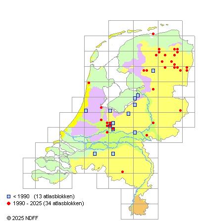 Het aantal atlasblokken (5x5 km) waarin de soort is gemeld binnen een periode van vijf jaar (vanaf 1980) of twintig jaar. Niet gecorrigeerd voor waarnemersinspanning en het aantal doorgegeven waarnemingen kan sterk variëren per periode, dus een trend in verspreiding kan hier niet direct uit worden afgelezen. Het opgegeven jaartal is het eerste jaar van de periode. Bron: gevalideerde waarnemingen uit de NDFF.