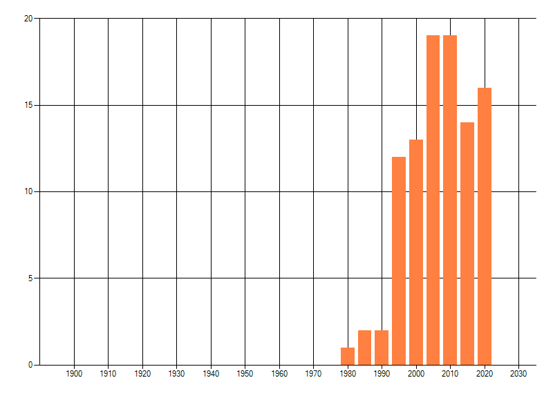 Het aantal atlasblokken (5x5 km) waarin de soort is gemeld binnen een periode van vijf jaar (vanaf 1980) of twintig jaar. Niet gecorrigeerd voor waarnemersinspanning en het aantal doorgegeven waarnemingen kan sterk variëren per periode, dus een trend in verspreiding kan hier niet direct uit worden afgelezen. Het opgegeven jaartal is het eerste jaar van de periode. Bron: gevalideerde waarnemingen uit de NDFF.